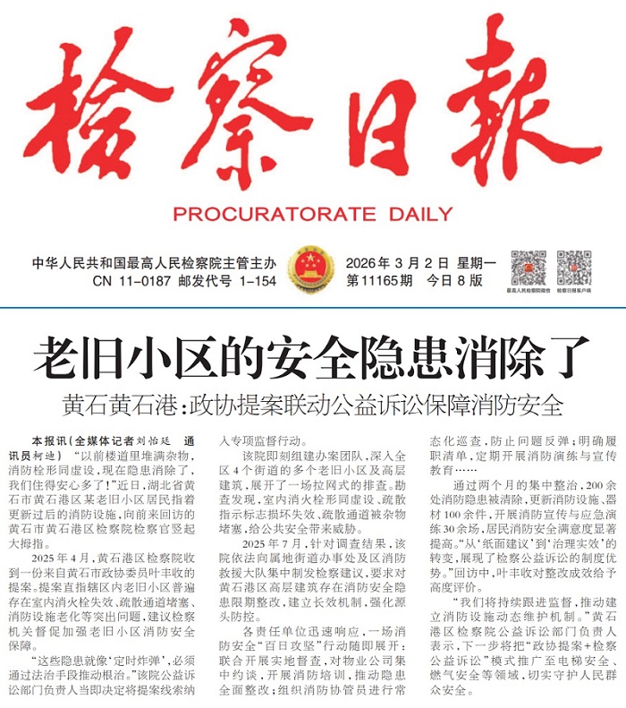 “我们将持续跟进监督,推动建立消防设施动态维护机制。”黄石港区检察院公益诉讼部门负责人表示,下一步将把“政协提案+检察公益诉讼”模式推广至电梯安全、燃气安全等领域,切实守护人民群众安全。